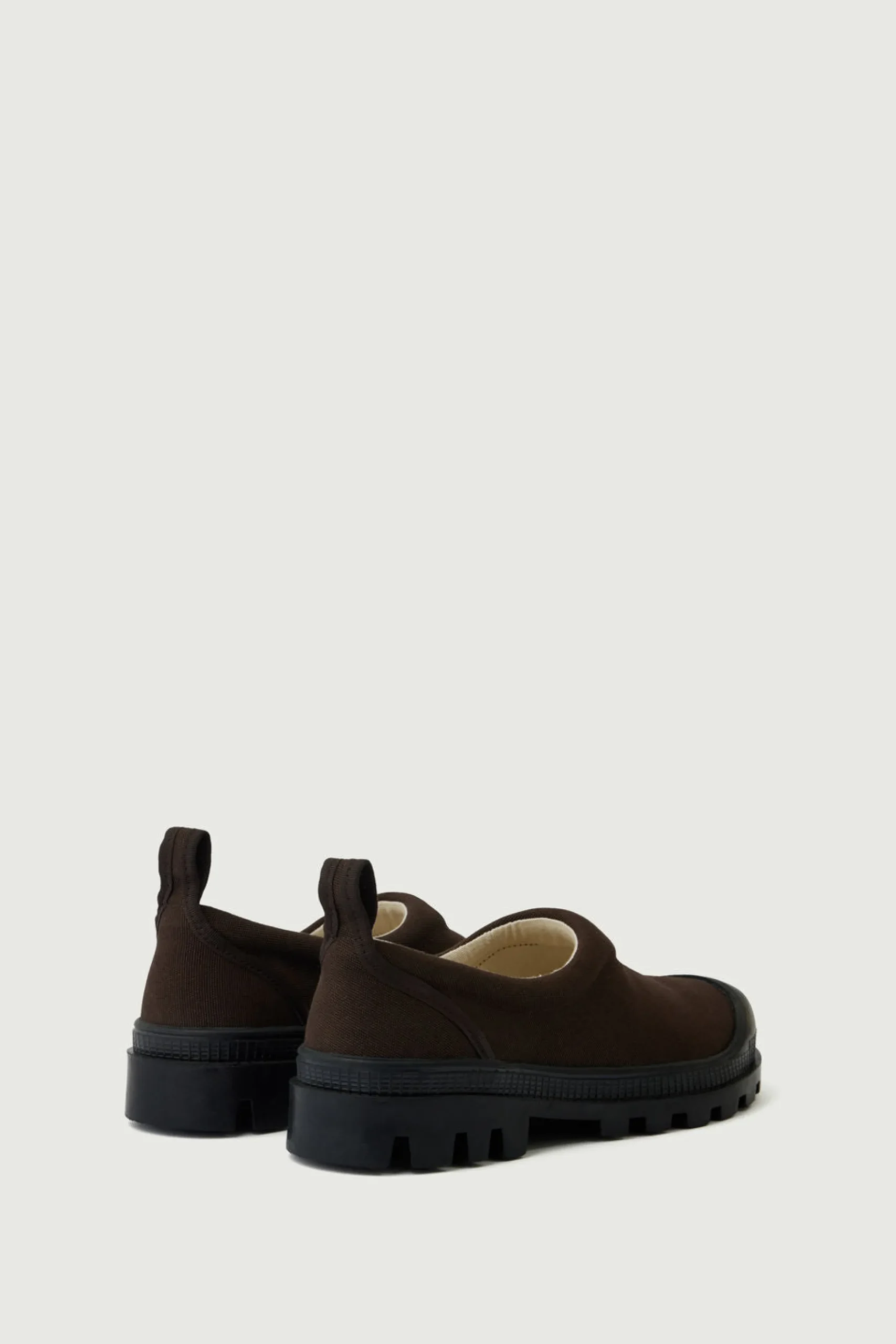 – Bottillons en canvas marron avec semelles crantées en caoutchouc noir