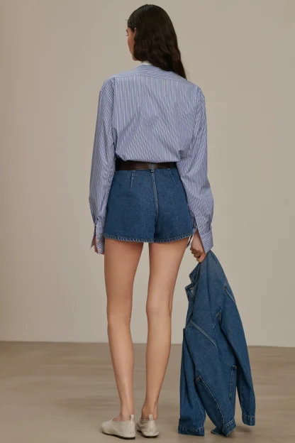 BERMUDES est une chemise en popeline de coton rayée. Sa coupe droite, avec une longue patte de boutonnage au centre devant vient lui donner son caractère. Une coupe classique du vestiaire S艙ur.