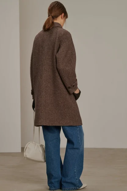 SIMBA est un manteau en lainage chevron. Doté de manches raglan coudées, il associe confort et allure. Le col classique et la patte de boutonnage cachée ajoutent une touche de raffinement. Avec ses quatre poches à rabat pratiques et les pattes de serrage boutonnées aux poignets, SIMBA en lainage boutonné est à la fois fonctionnel et sophistiqué.