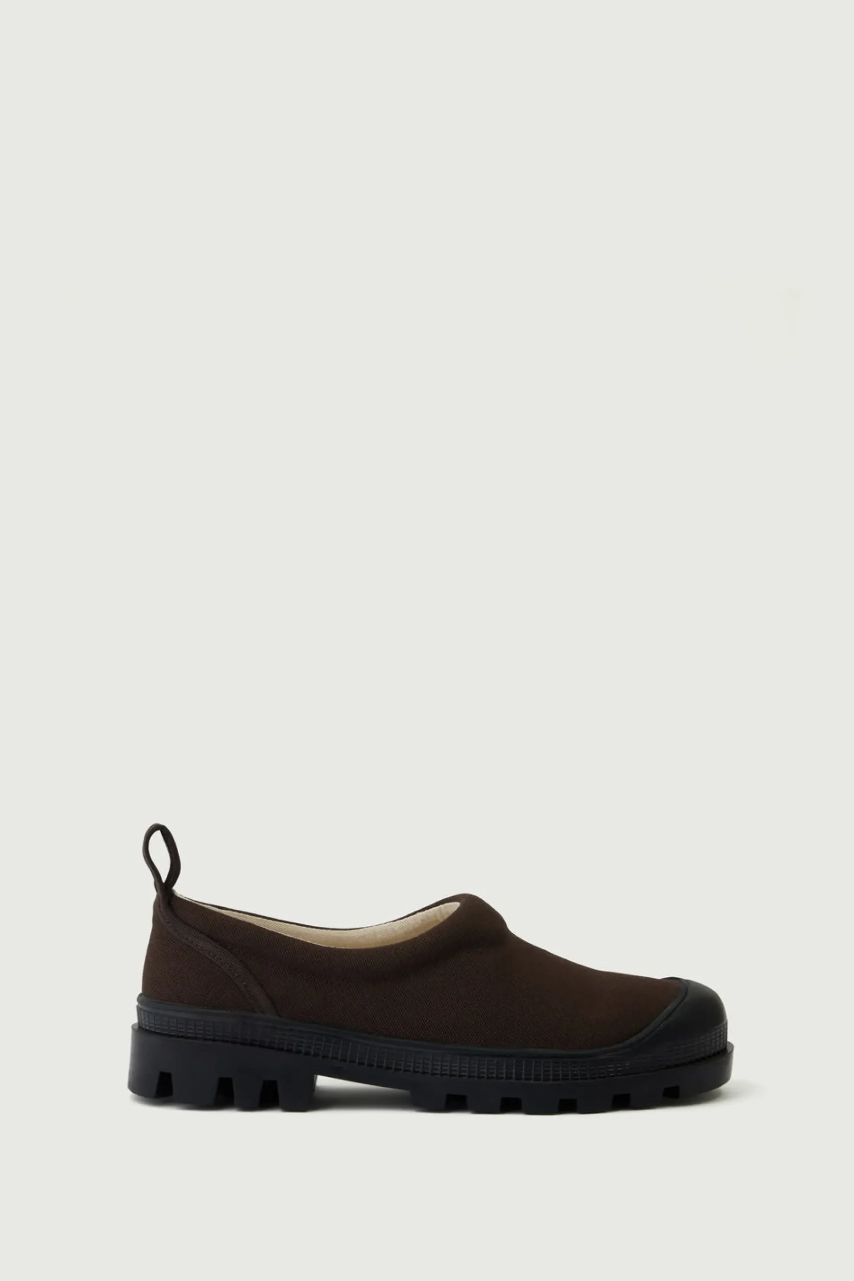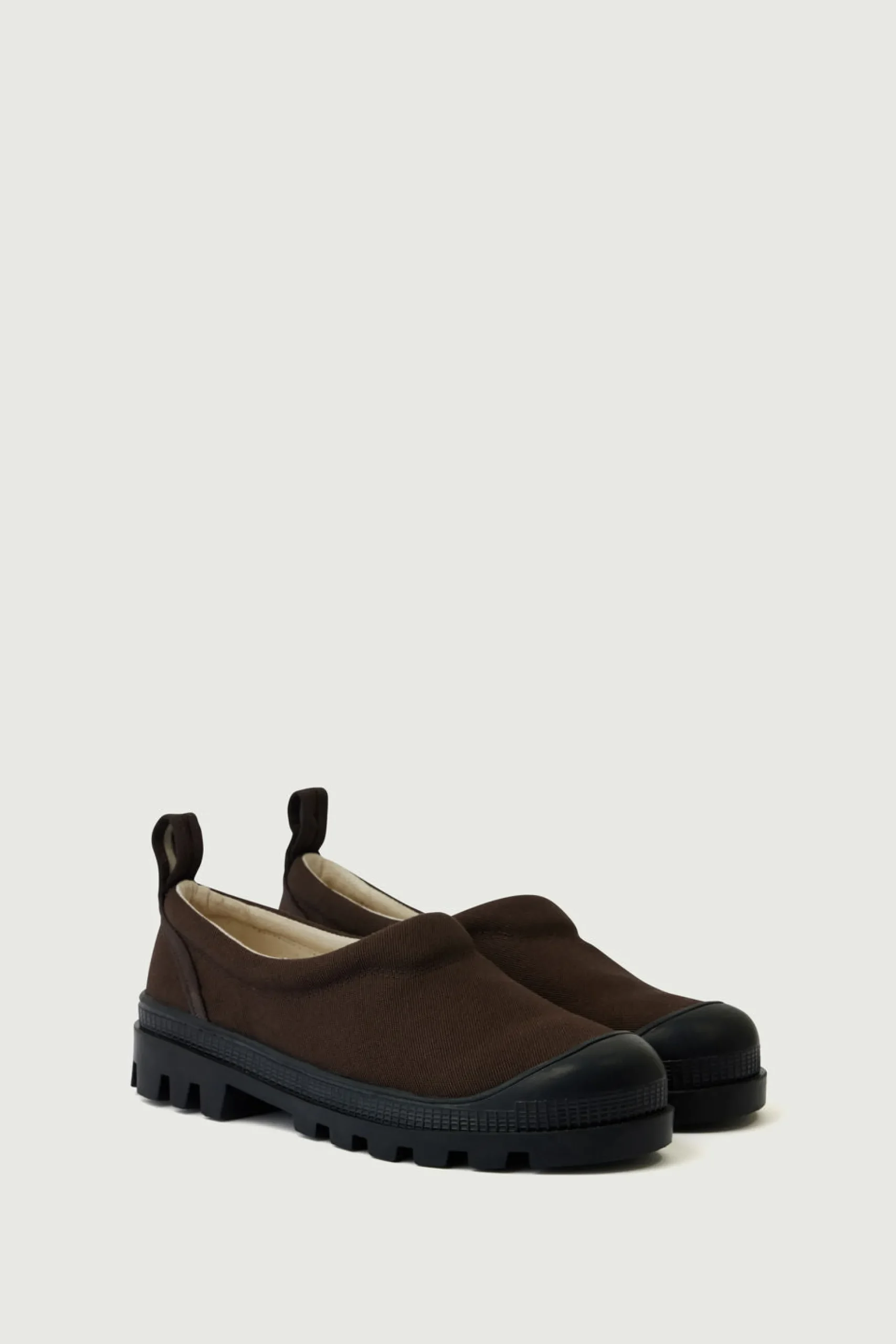 – Bottillons en canvas marron avec semelles crantées en caoutchouc noir