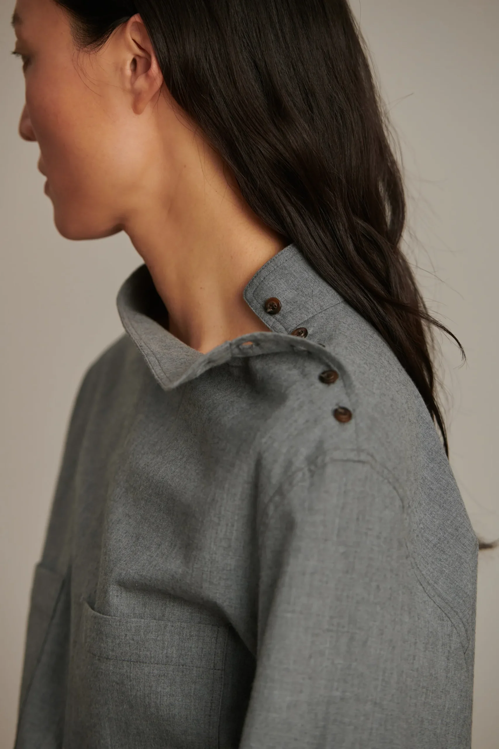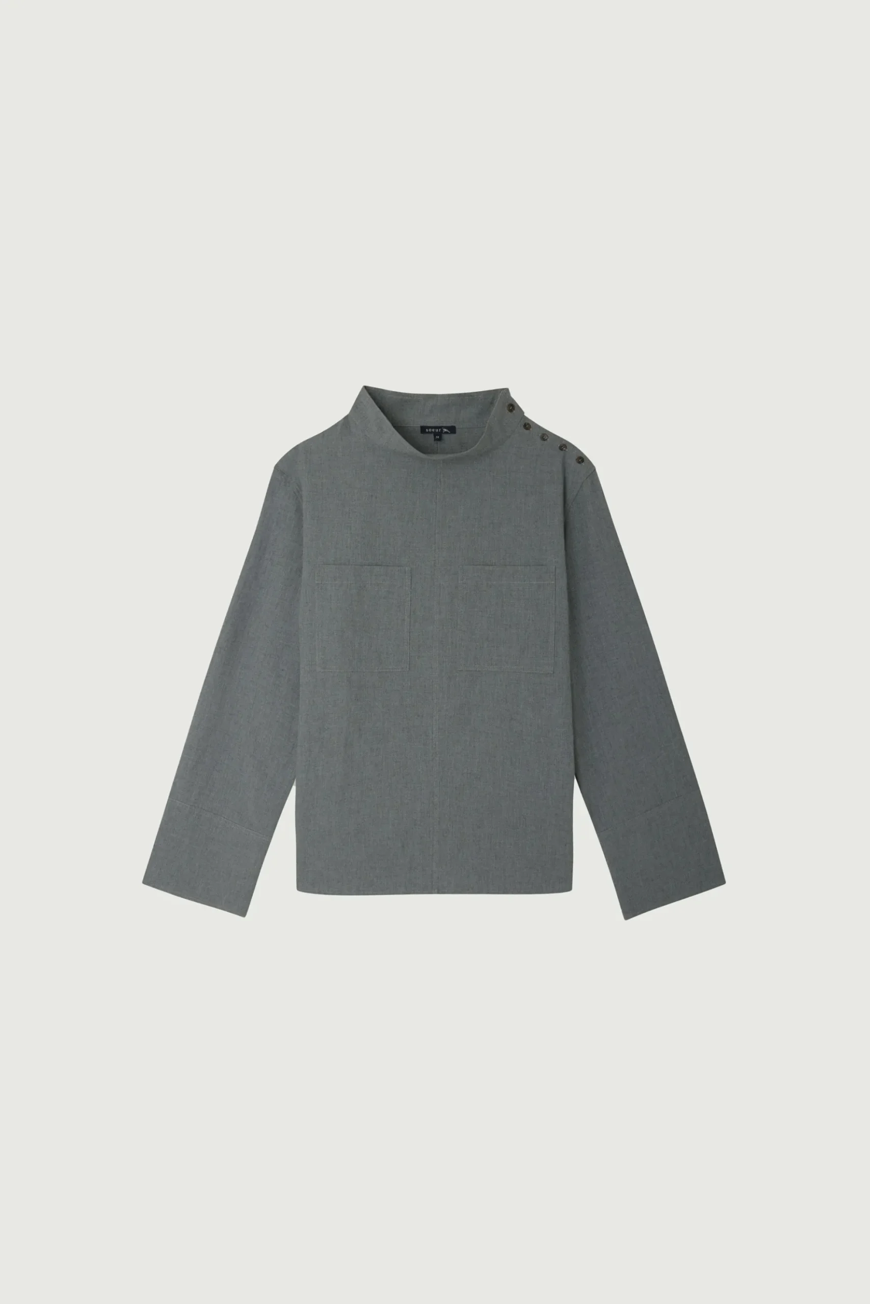 CANNES est une blouse en toile de coton laine. Avec sa coupe droite et ses manches très longues, et son col cheminé dégagé du cou, elle offre un style élégant et confortable.