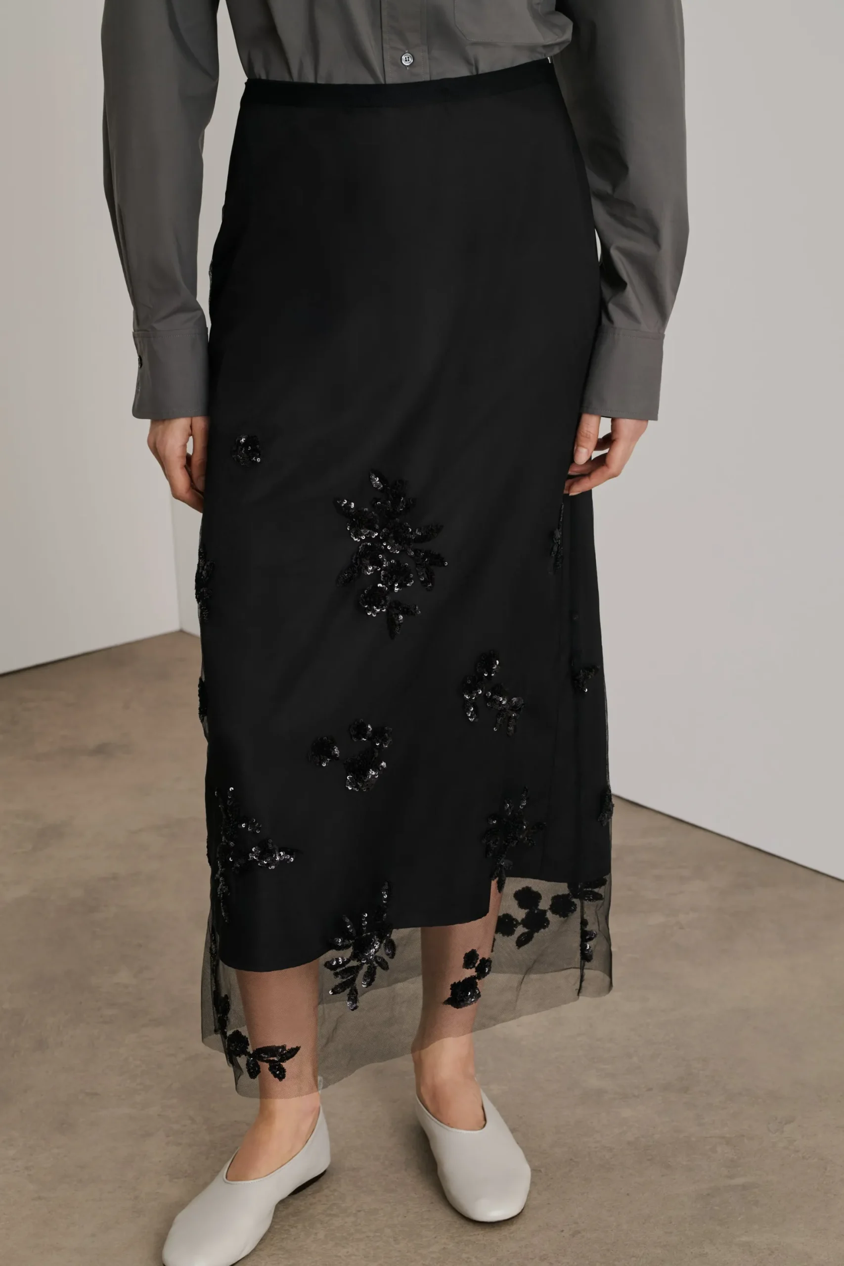 Jupe longue noire avec tulle et broderies