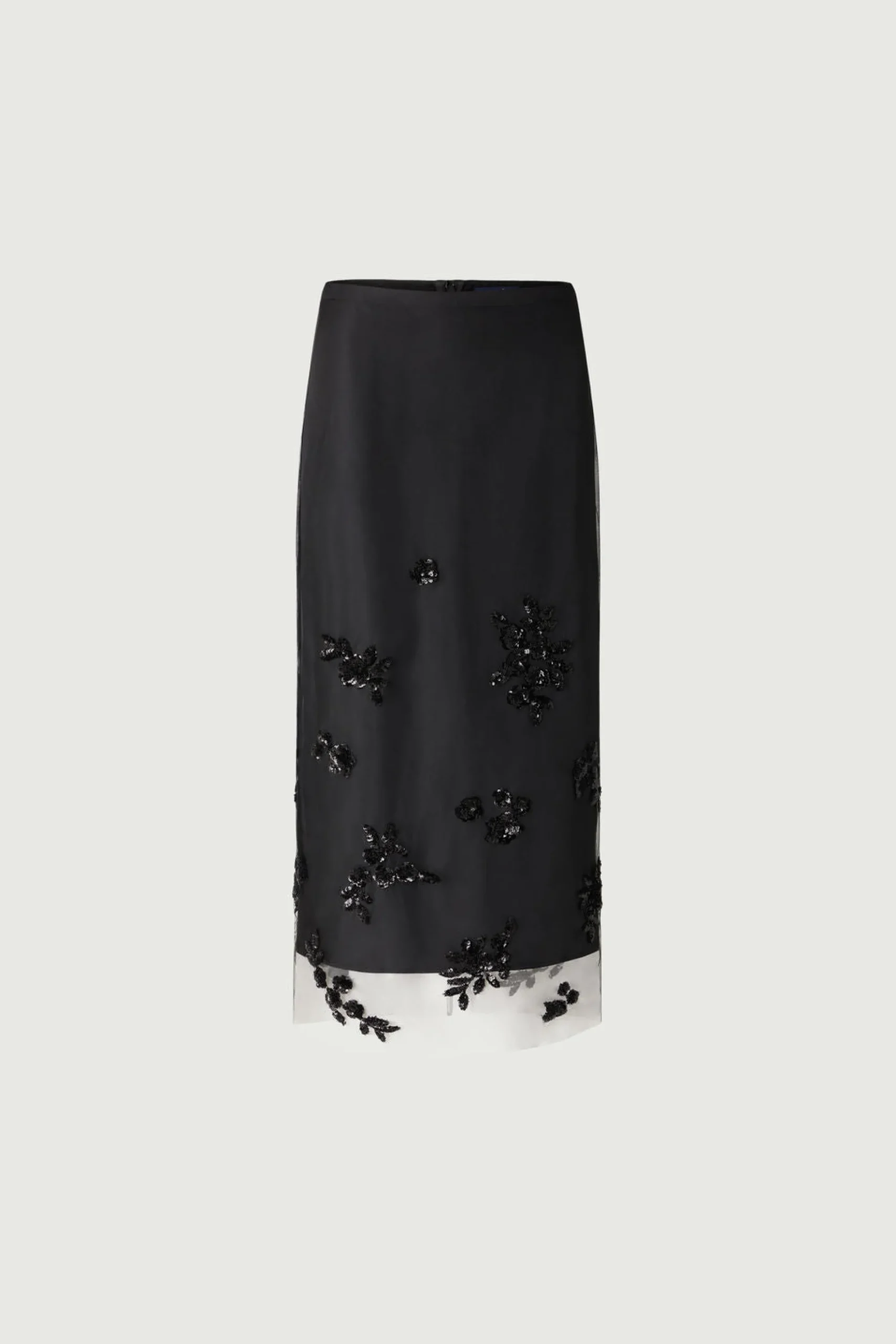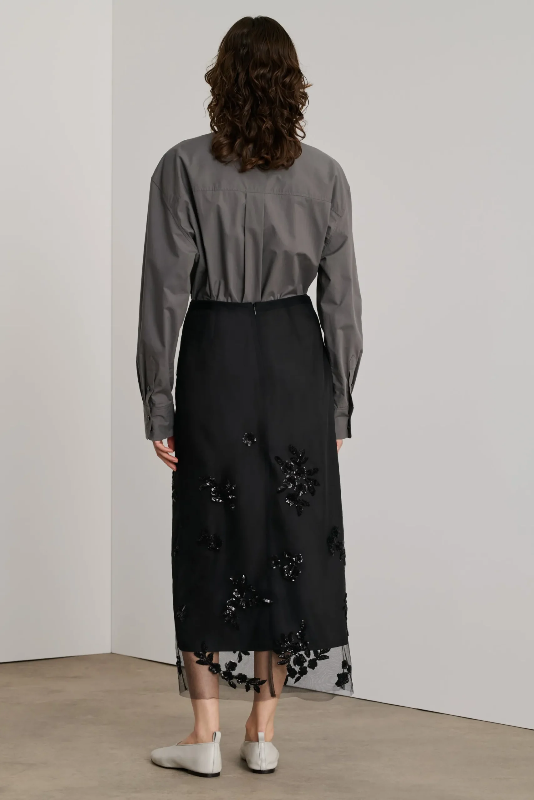 GRACE est une jupe longue élégante en tulle et applications de broderies. Faite de deux parties : un jupon doublure pour freiner la transparence, et par-dessus une jupe en tulle noire sur-brodées d’éléments floraux en sequins noirs du bas vers le haut. Elle se ferme par deux zips invisibles. Versatile cette jupe peut se porter avec ou sans son jupon selon l’audace.