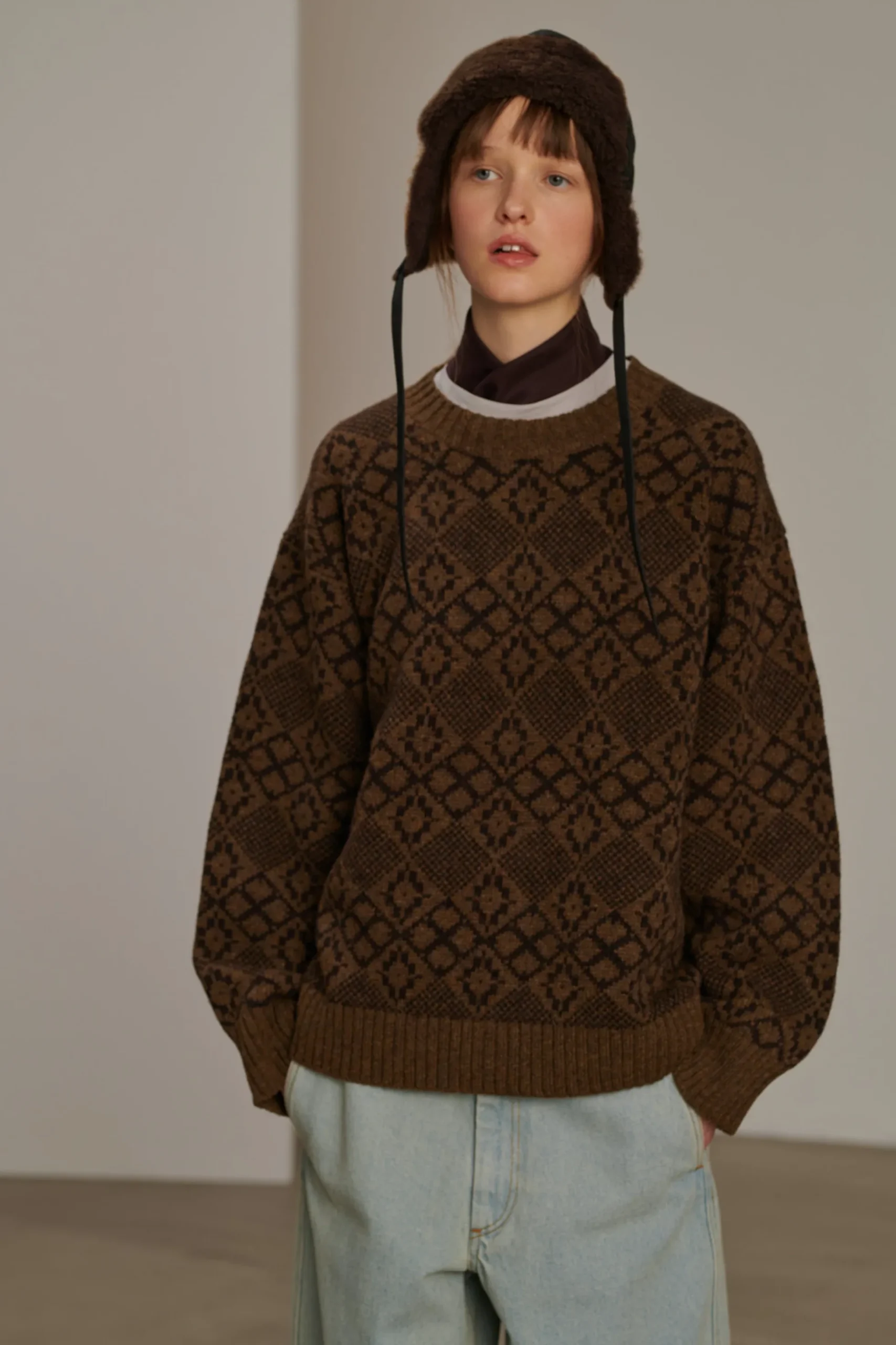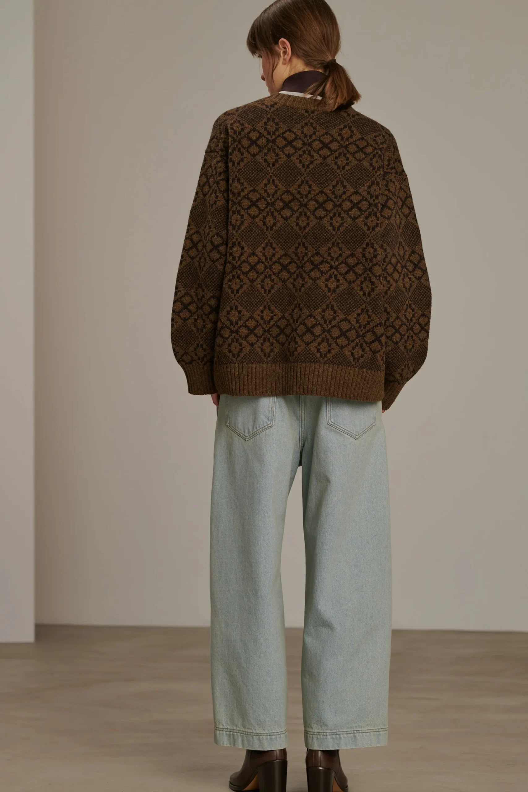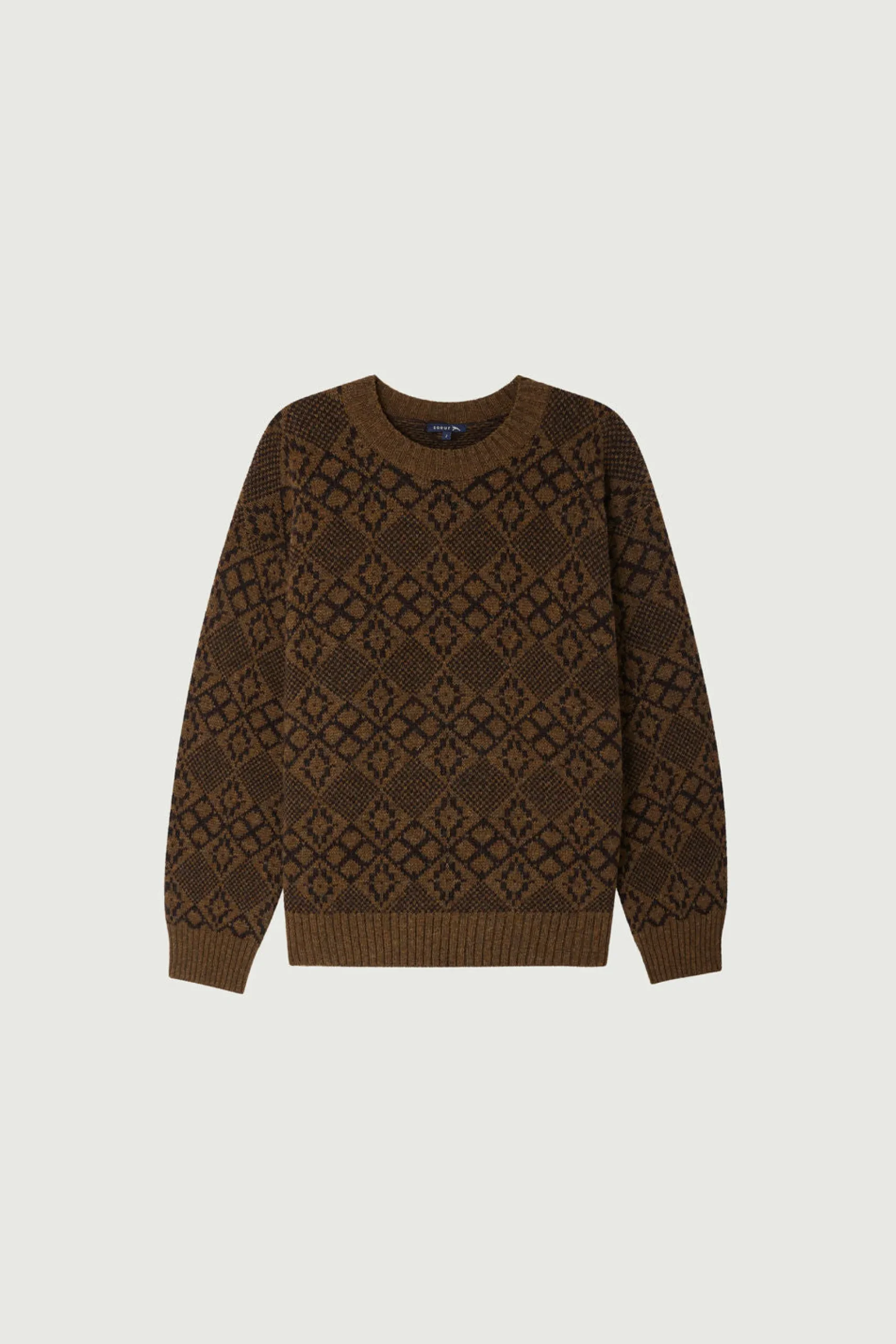 BIDART est un pull à manches longues, col rond, tricoté dans un fil mélangé. Sa coupe est empruntée au pull d’homme classique, auquel un jacquard d’inspiration anglaise a été apposé en motif intégral dans une palette de tons marrons.