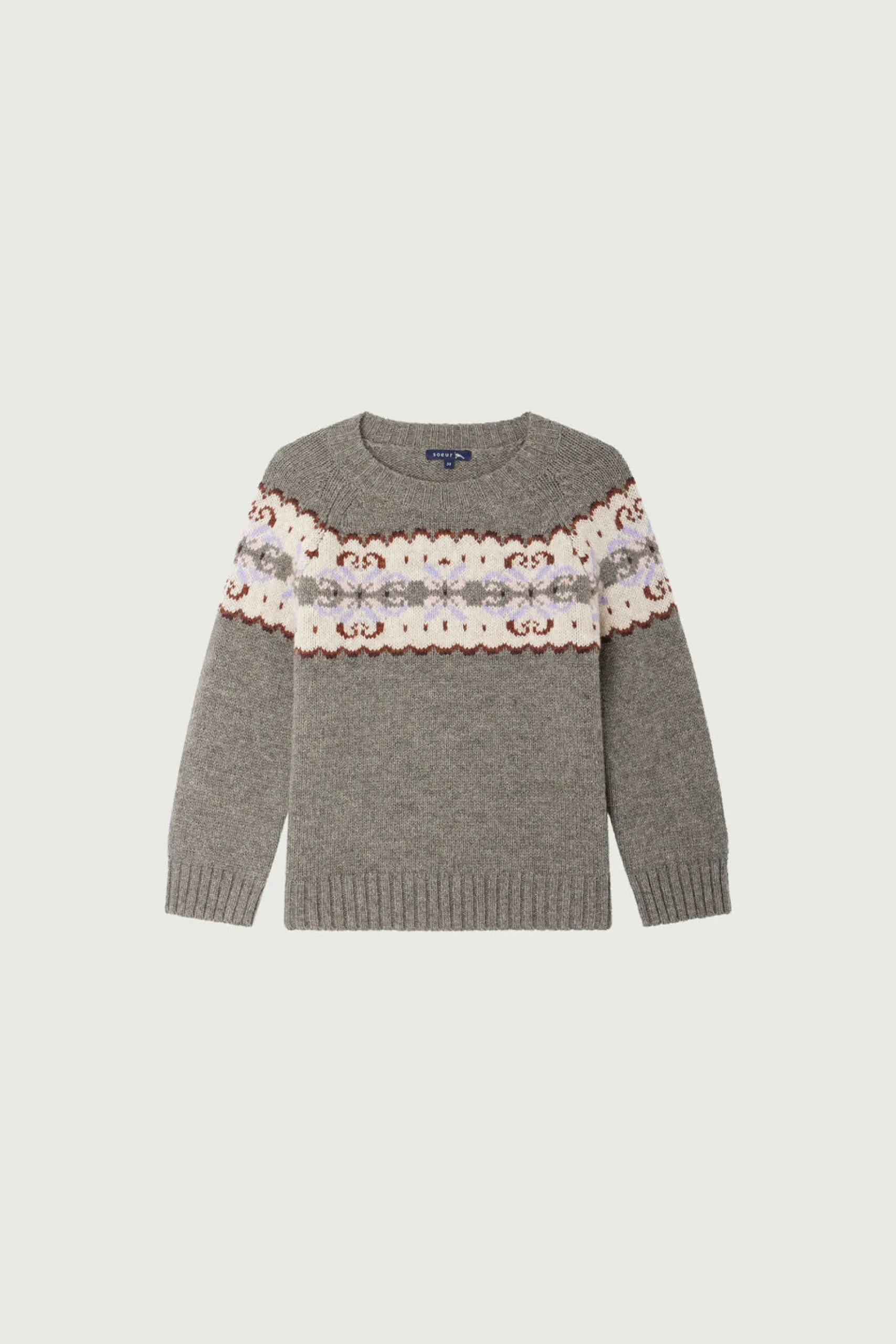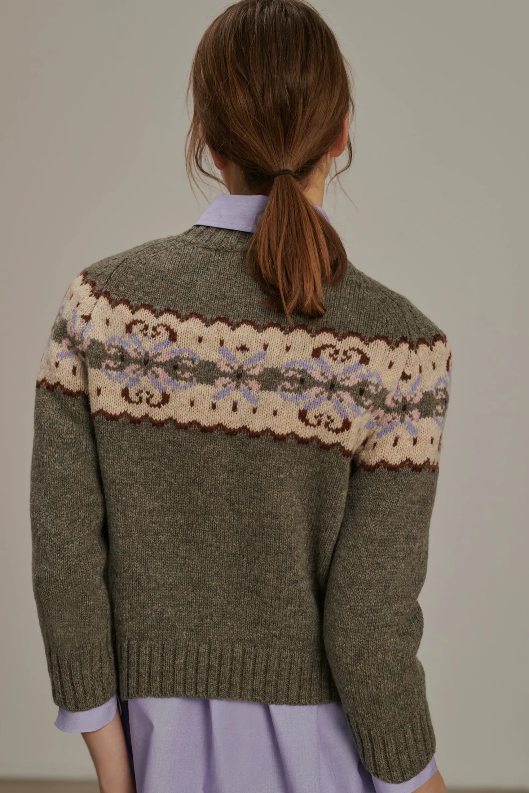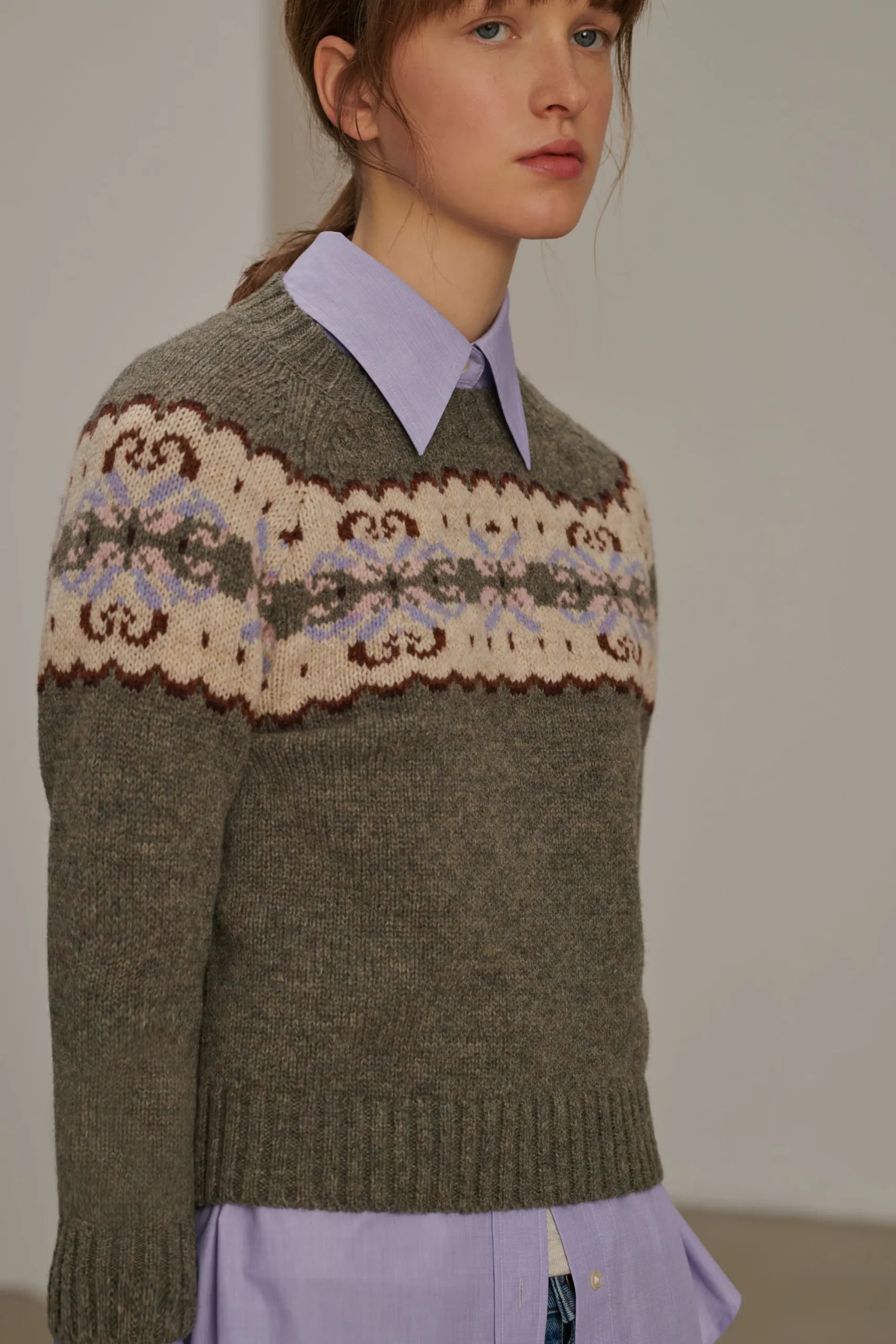 BRITTANY est un pull tricoté dans une laine shetland mélangée. Sa coupe est près du corps et ses manches sont courtes, pour être porté par-dessus une chemise laissant apparaître le col et les poignets. Orné d’un jacquard placé d’inspiration anglaise, sa palette de couleurs hivernale mélange gris et lilas.