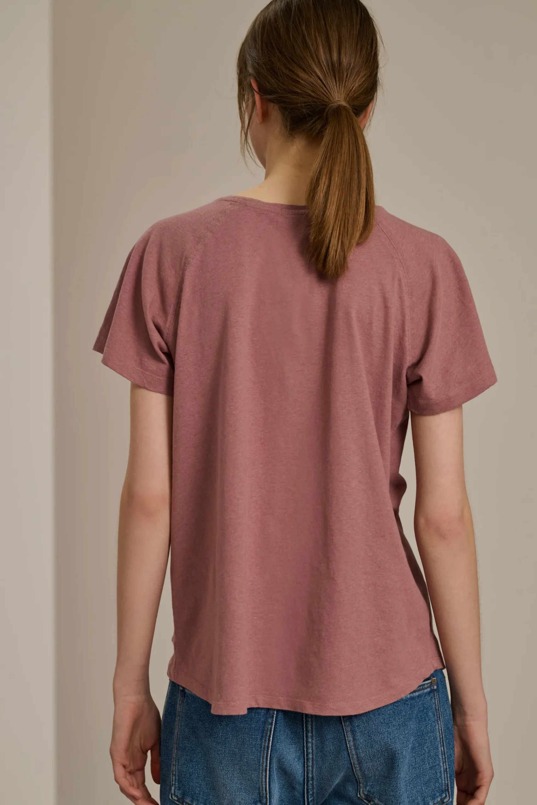 VAL est un t-shirt col rond iconique du vestiaire Soeur. Il est sérigraphié (impression directe sur le textile) de notre monogramme « S ». C’est un jersey qui mélange des fils de coton et de lin, lui donnant une main authentique et moins « sportwear » malgré son emmanchure raglan et ses revers aux manches.